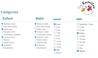 Chaque espace est dédié à une tranche d’âge où vous avez la possibilité d’utiliser les filtres pour trouver votre bonheur, vous pouvez aussi créer votre liste d’envie mais attention, la plupart de mes pièces sont uniques alors ne trainez pas....
